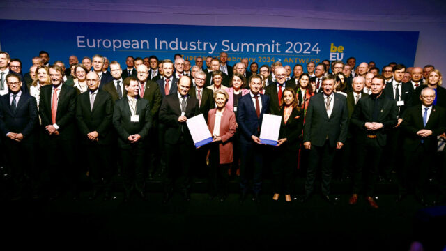 Gewerkschaftsvertreter wie IGBCE-Chef Michael Vassiliadis (rechts) und rund siebzig Konzernchef*innen aus fast zwanzig energieintensiven Branchen haben im Februar 2024 die Antwerpener Erklärung für einen „Industrial Deal“ unterzeichnet.