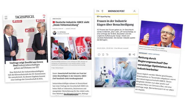 Die Ergebnisse werden den Mitgliedern regelmäßig über die IGBCE-eigenen Medien und Kanäle berichtet. Im Magazin „Profil“ haben sie einen festen Platz in der Rubrik „Dialog“. Gleichzeitig trägt die IGBCE Sorge dafür, dass die Stimme ihrer Mitglieder auch in der Öffentlichkeit Gehör findet. Deshalb werden sie offensiv in der Pressearbeit eingesetzt. Unzählige Medien haben die Daten als „Stimme der Industriebeschäftigten“ in den vergangenen Jahren genauso aufgegriffen wie die damit verbundenen Forderungen der IGBCE.
