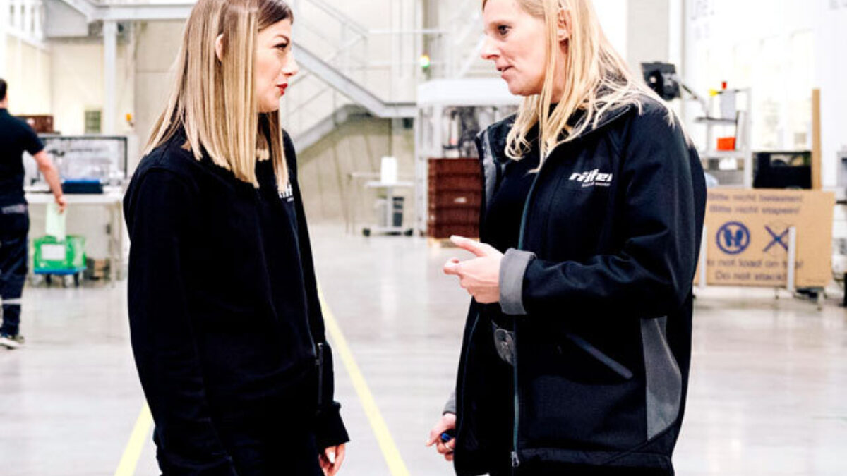 Der Arbeitstag von Sabrina Schulze (rechts) beginnt frühmorgens. Dann kann die Betriebsratsvorsitzende beim Kunststoffhersteller Ritter die Nachtschicht noch erreichen und hat Gelegenheit, mit den Beschäftigten zu reden. 2021 entschied sich die gelernte Kfz-Mechanikerin, mit Unterstützung der IGBCE einen Betriebsrat zu gründen. Seitdem kämpft sie für ihr Recht – und das ihrer Kolleg*innen. Hartnäckig, durchsetzungsfähig, mit starker Stimme – und mit Rückendeckung der IGBCE.