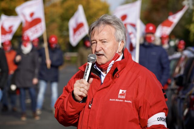 Frank Seeliger, Leiter des IG-BCE-Bezirks Münster-Bielefeld, bei einem Warnstreik bei Aenova Haupt Pharma.